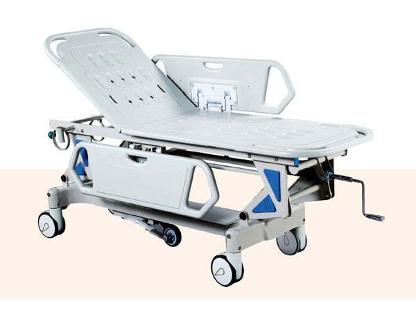 1manivelle 2 barrières pliable en ABS Relève -Buste réglable par vérin à gaz Hauteur variable Surface de couchage en ABS Emplacement à oxygène Potence à sérum Livré avec matelas