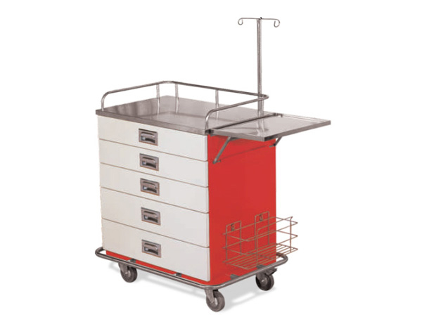 5 tiroirs 1 porte-déchets1 porte sérumFabriqué en acier inoxydable.Montés sur 4 roues pivotantes